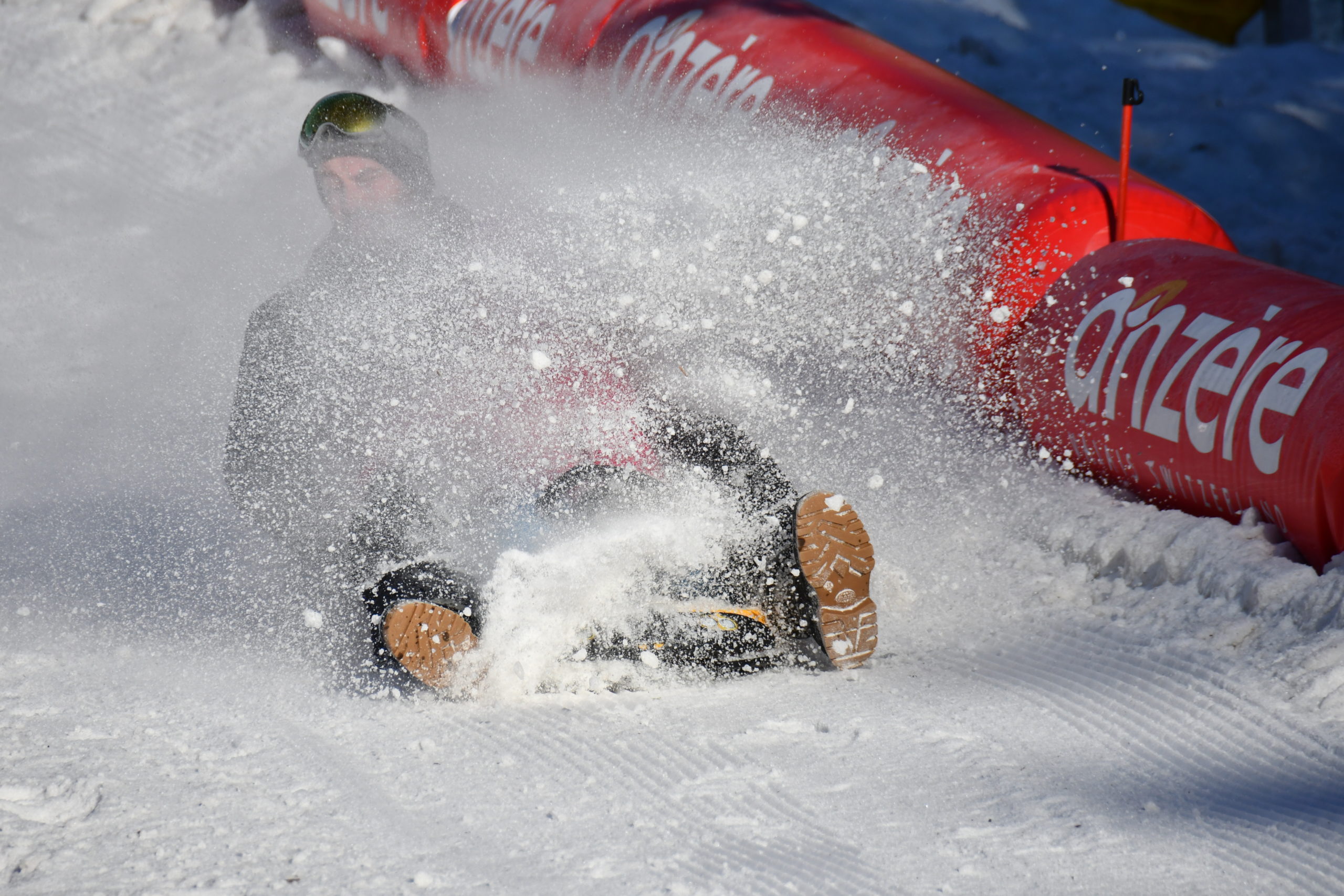 Descente en luge dans la neige poudreuse, imprévus les effets du freinage