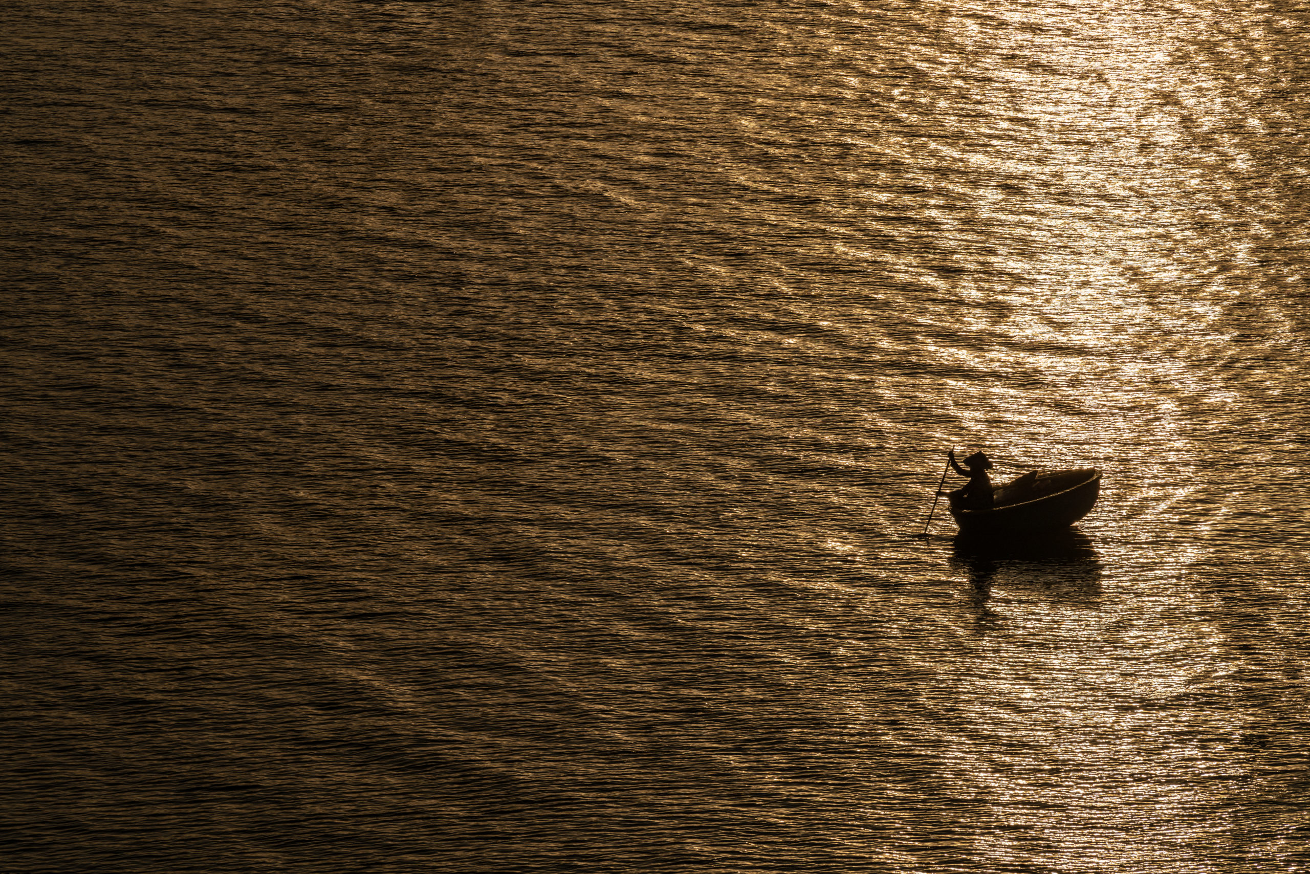 Au crépuscule, une embarcation avance lentement sur une rivière dorée. Le mouvement est doux, presque silencieux, invitant à ralentir et à s'accorder au rythme naturel du voyage, un instant suspendu rempli de poésie.