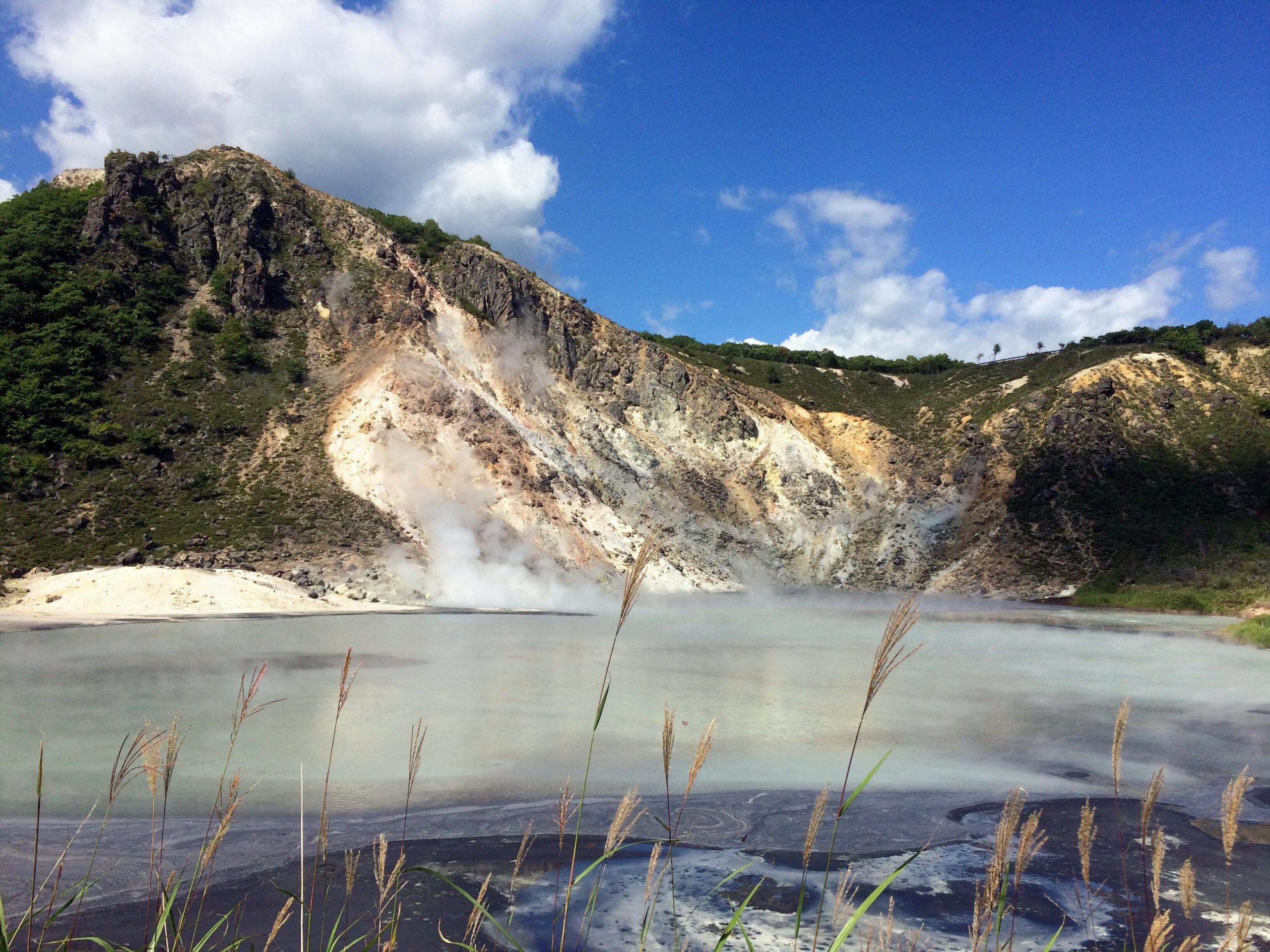 Dans un parc naturel d'Hokkaïdo, après plusieurs minutes d'attente, j'ai pu fixer cet instant avec ses différents "mouvements" : nonchalance des graminées, calme apparent de l'eau des berges, impétuosité du gyeser jaillissant, ballade des nuages .